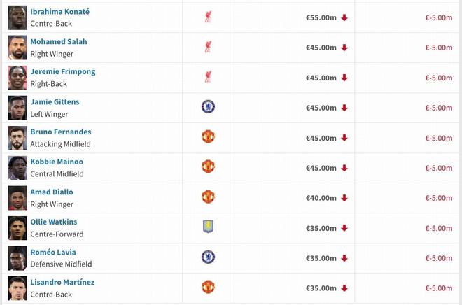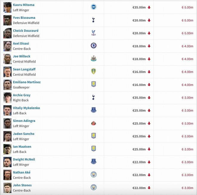 • 英超身价跌幅榜:罗德里、福登下跌2000万欧,维尔茨、萨卡下降1000万欧