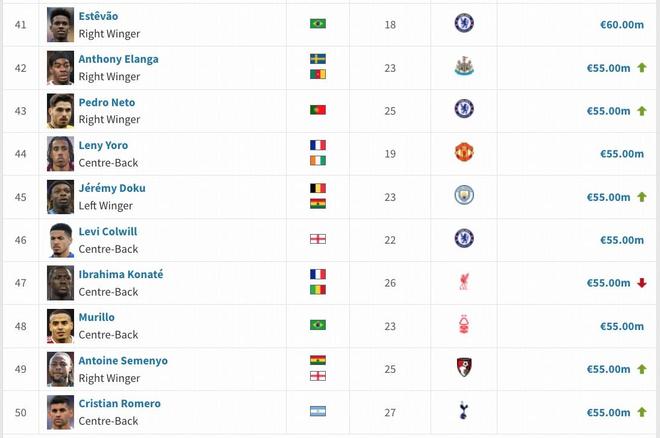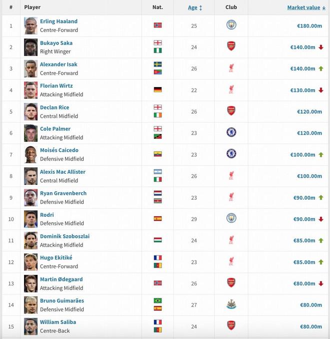 • 英超身价变更:维尔茨降至1.3亿欧,萨卡降至1.4亿欧,凯塞多升至1亿欧