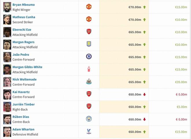 • 英超身价涨幅榜:沃尔特马德狂飙3500万欧,伊萨克上涨2000万欧